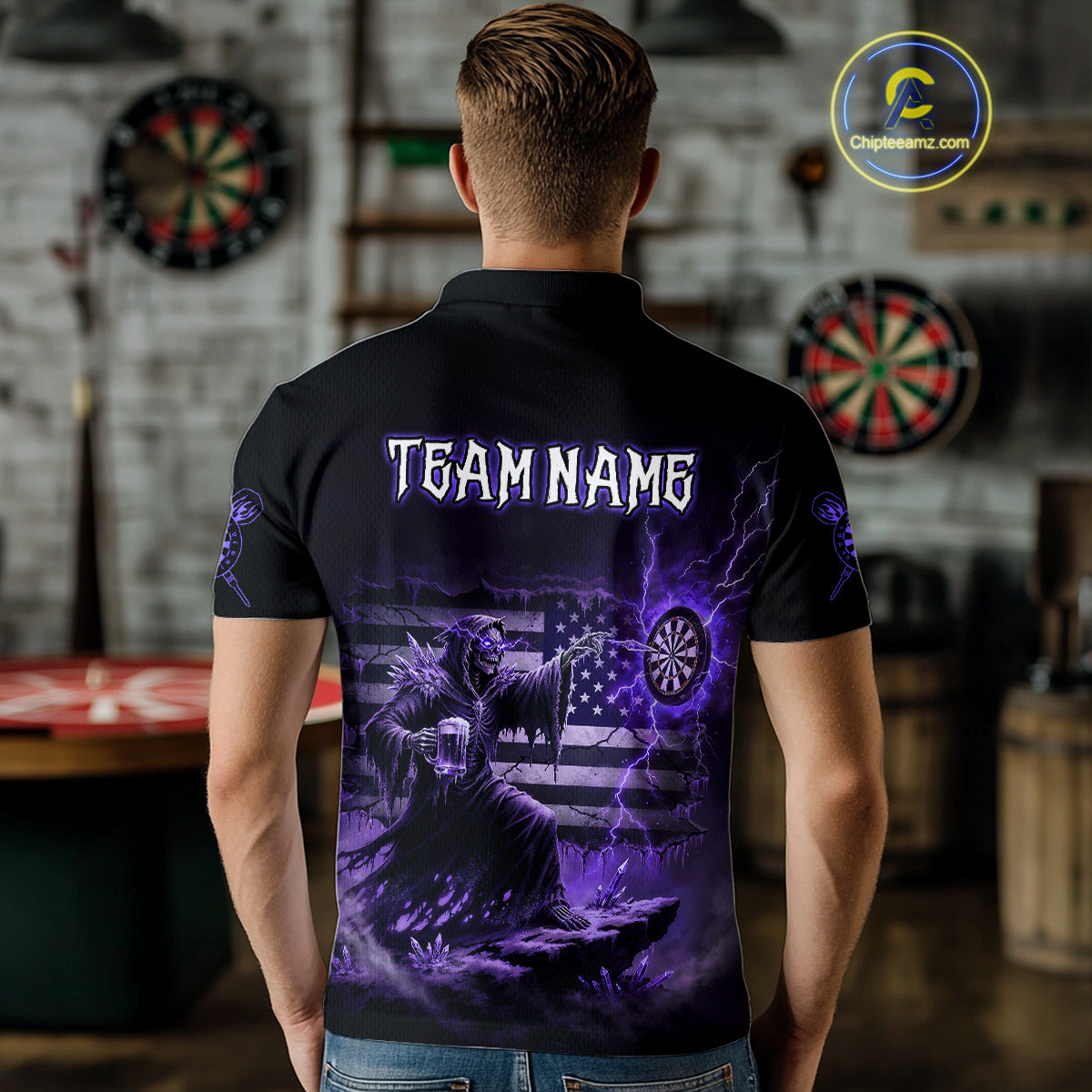 Custom Lightning Purple Grim Reaper Beer Funny Men Darts Polo Shirt US Flag Dart Jerseys NYN1837