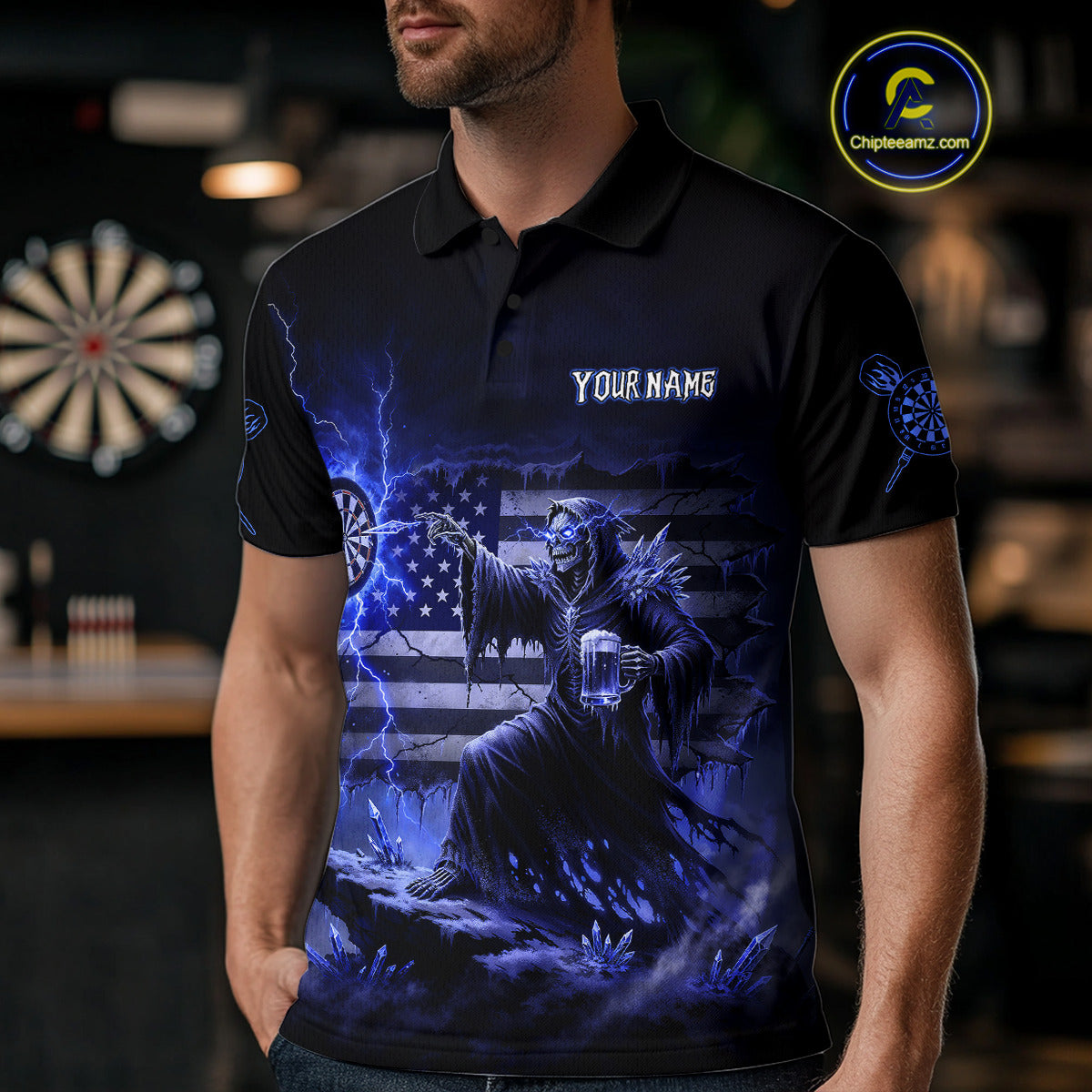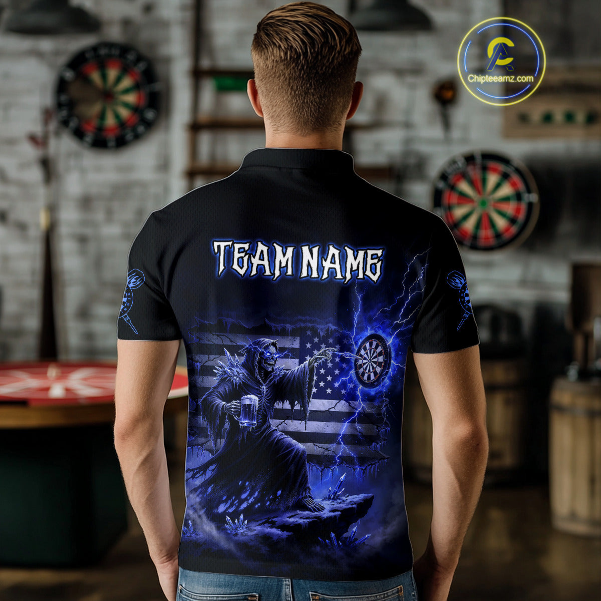 Custom Lightning Blue Grim Reaper Beer Funny Men Darts Polo Shirt US Flag Dart Jerseys NYN1838