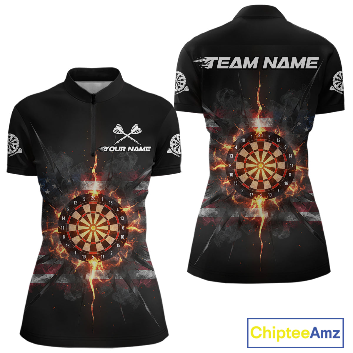 Smoke US Flag Fire Flame Dartboard Custom Women Darts Quarter-Zip Shirt Patriotic Dart Jerseys NYN1859