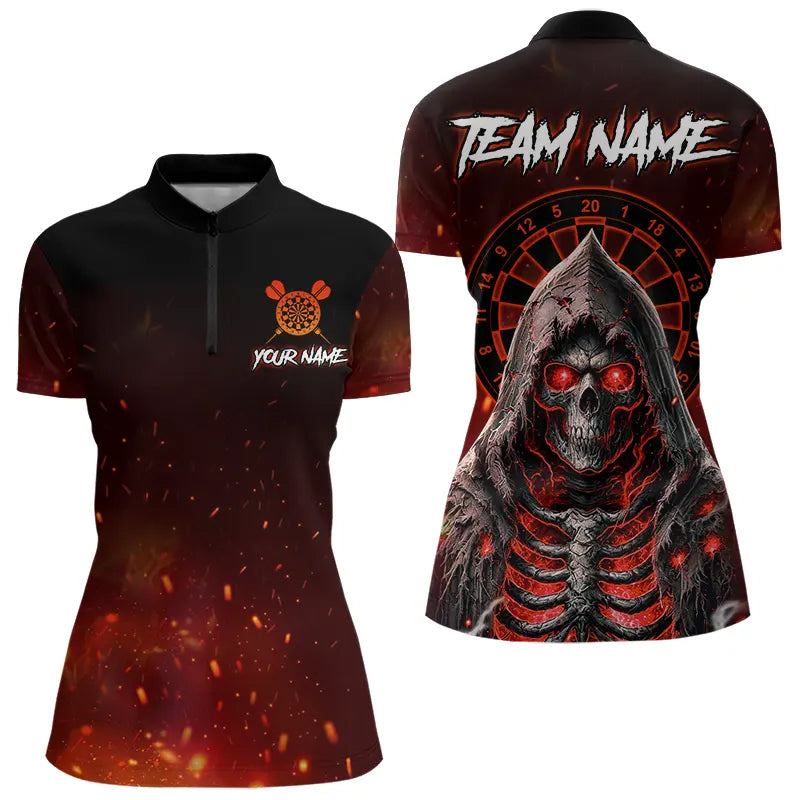 Red And Black Glowing Fire Death Skeleton Dart Shirts For Women Custom Dart Jerseys Polo & 1/4 Zip TDM3712