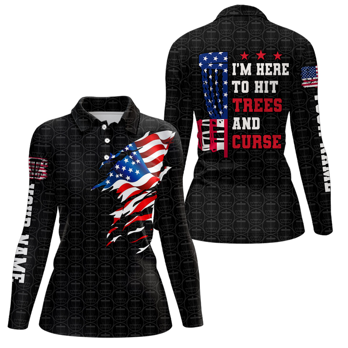 American flag Women disc golf polo shirts custom black disc golf pattern i'm here to hit trees & curse NQS6288