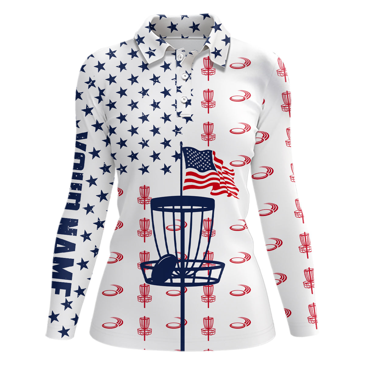 Red, white and blue American flag Womens disc golf polo shirt custom patriotic disc golf shirt NQS6766