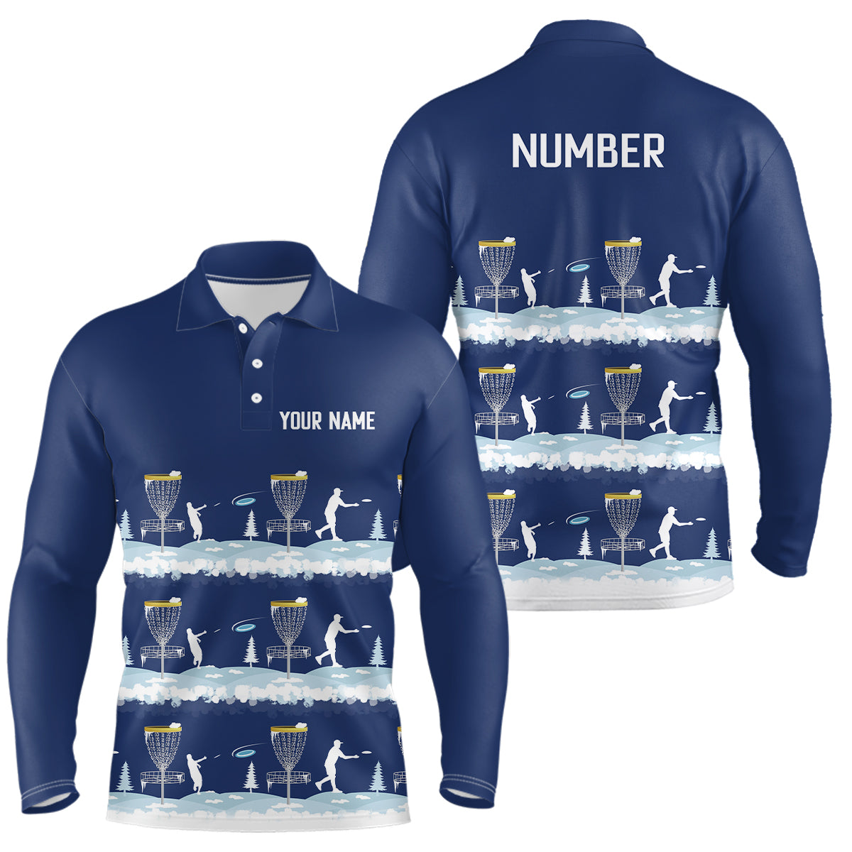 Winter Disc Golf Pattern Mens Disc Golf Polo Shirt Custom Name And Number Disc Golf Gifts For Men | Dark Blue YYD0018