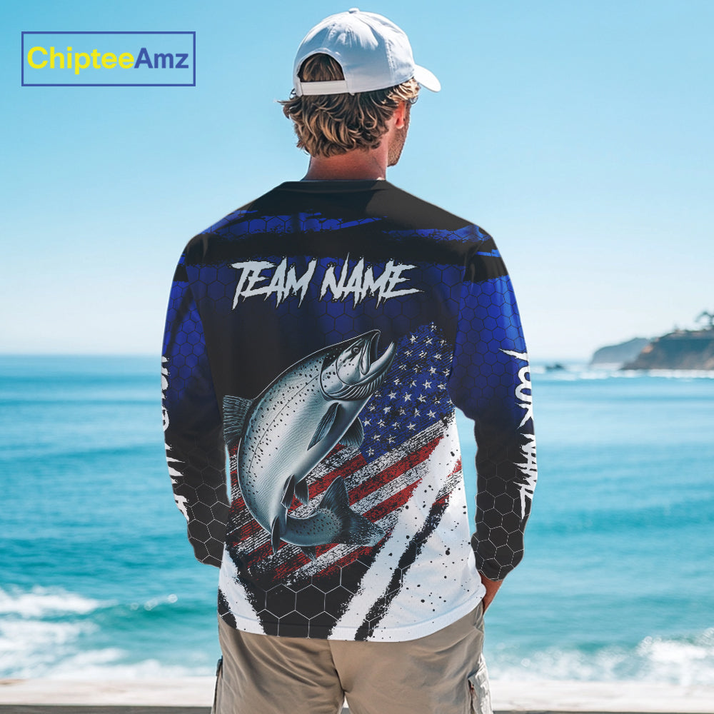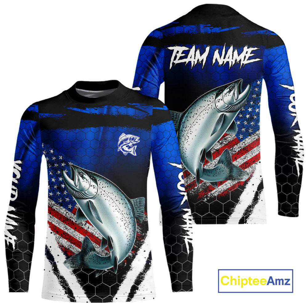 Salmon fishing American Flag Custom patriotic long sleeve team Salmon fishing shirts | Blue NQS10687