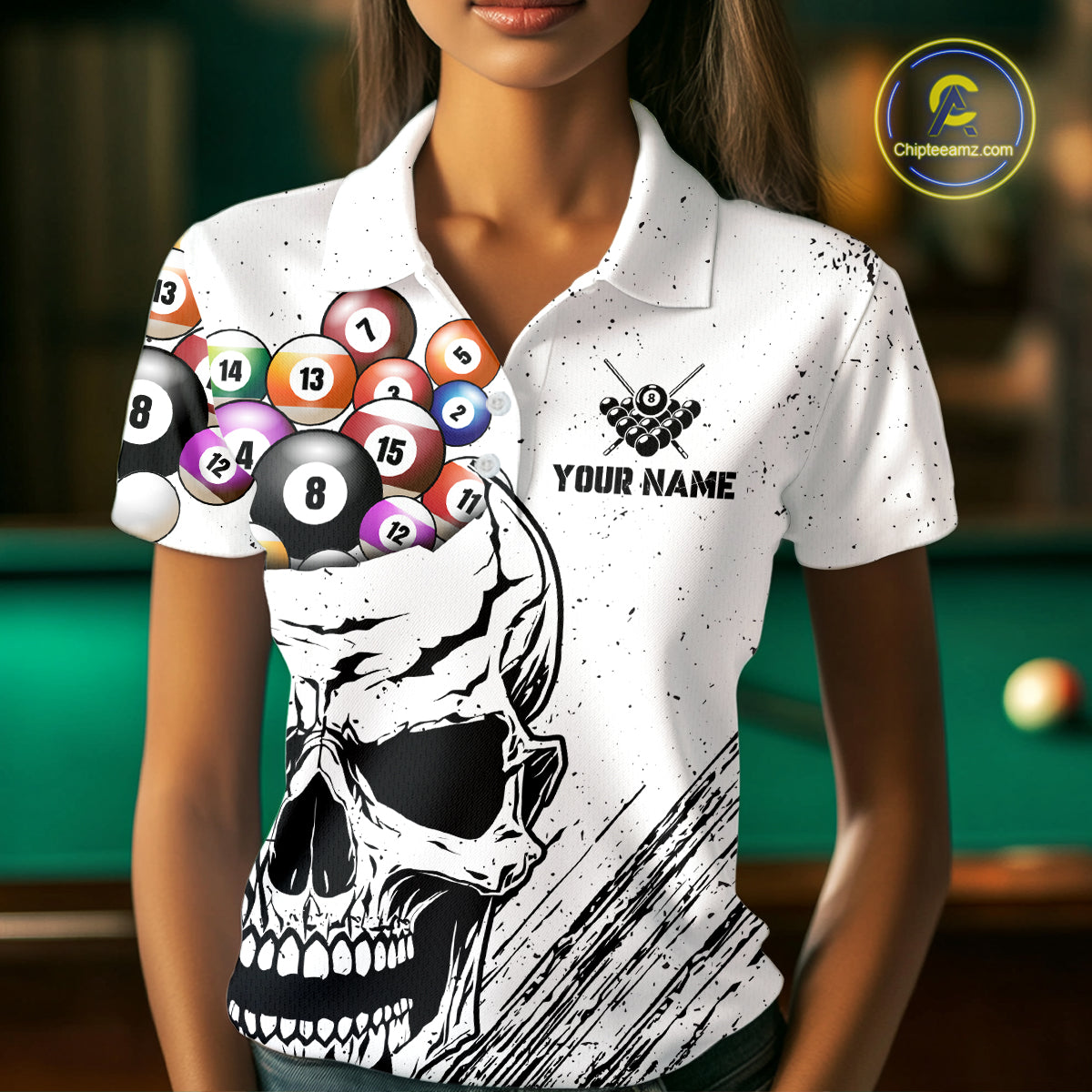 Personalized White Grunge Billiard Balls Skull Pool Shirt For Women, Funny Billiard Team Jersey TDM4578
