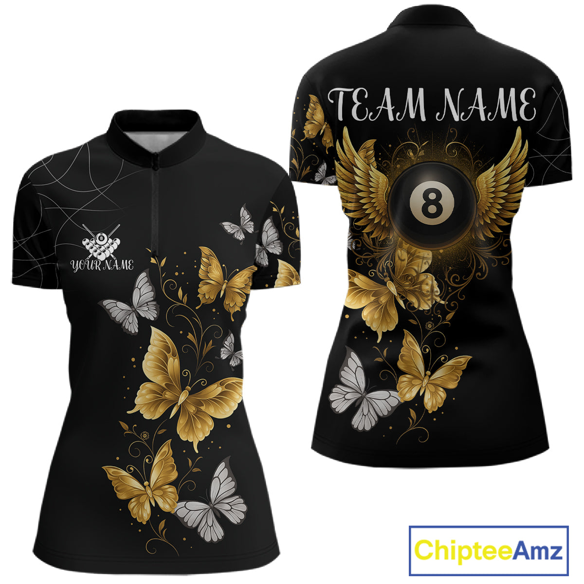 Personalized Golden 8 Ball Wings Butterflies Billiard Shirt For Women Custom Funny Pool Team Jersey TDM4777