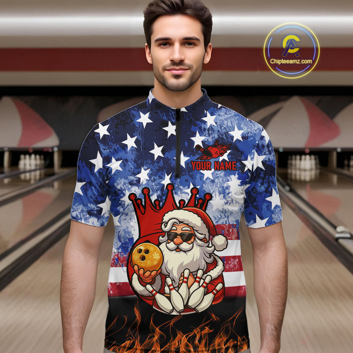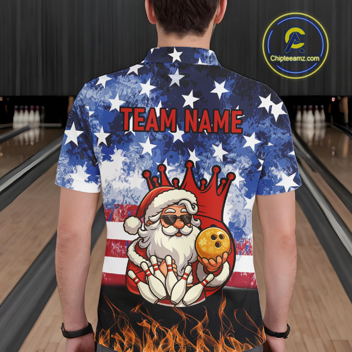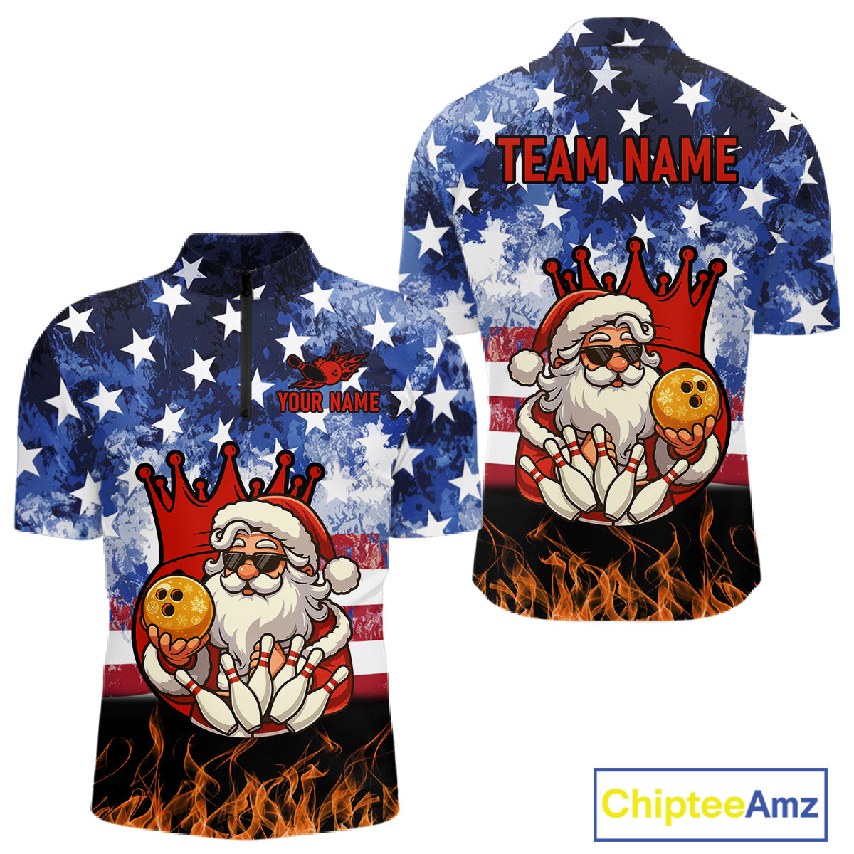 Custom American Flag Flame Funny Santa Christmas Bowling Shirts For Men, Bowling Team Jersey NQS11040