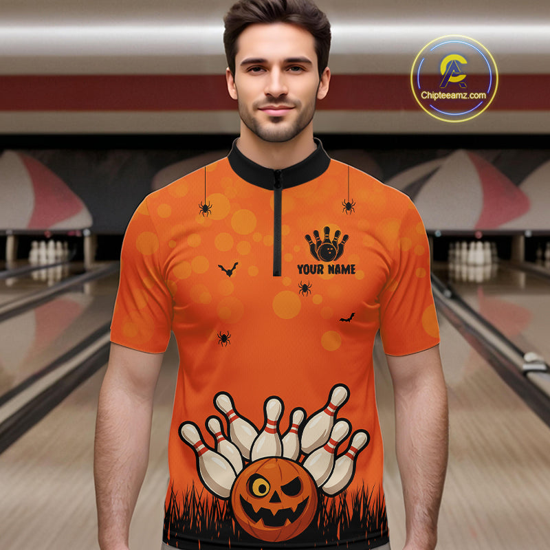 Custom Funny orange Bowling Team Shirt Halloween Polo & Quarter-Zip Bowling Jersey for Men NQS10396