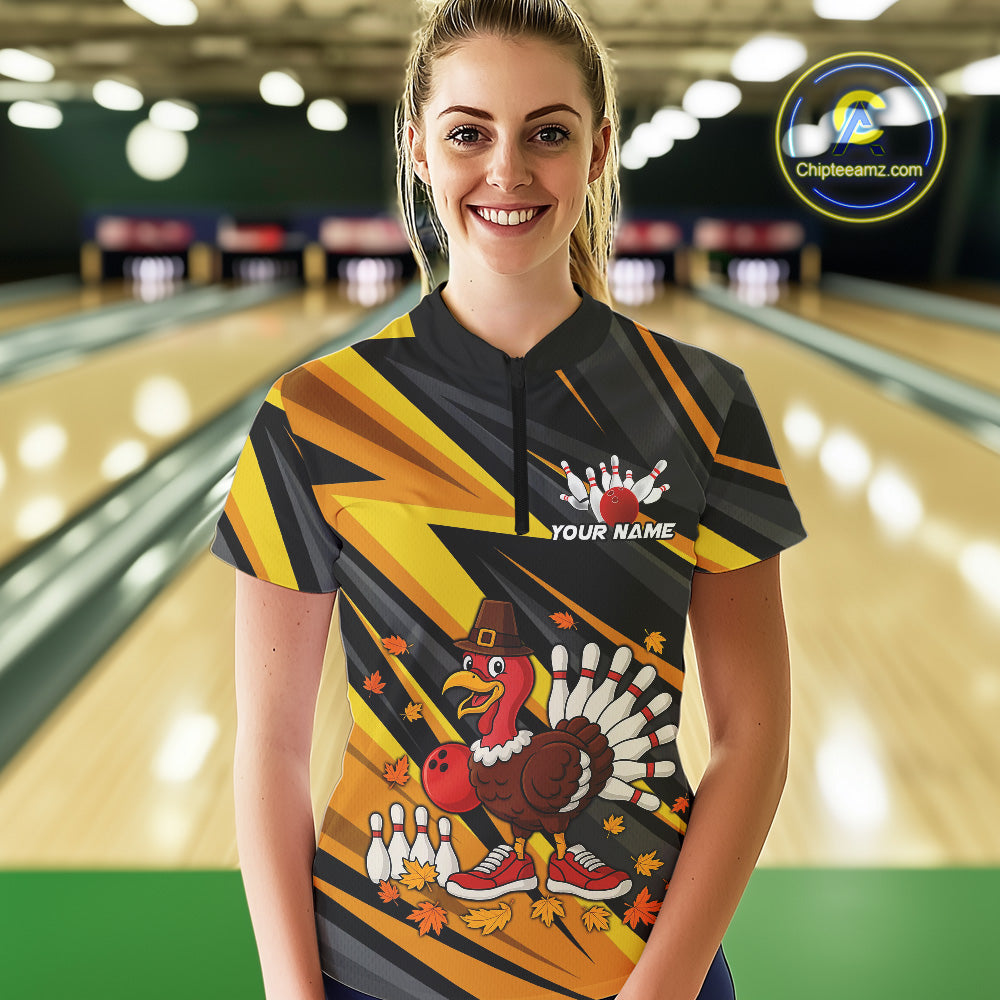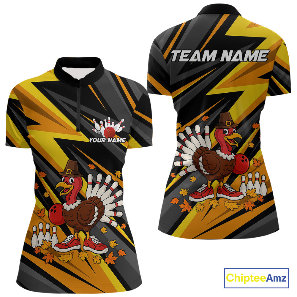 Custom Funny Turkey Bowling Shirts For Women, Black and Yellow Camo Thanksgiving Bowling Shirt Team NQS10683