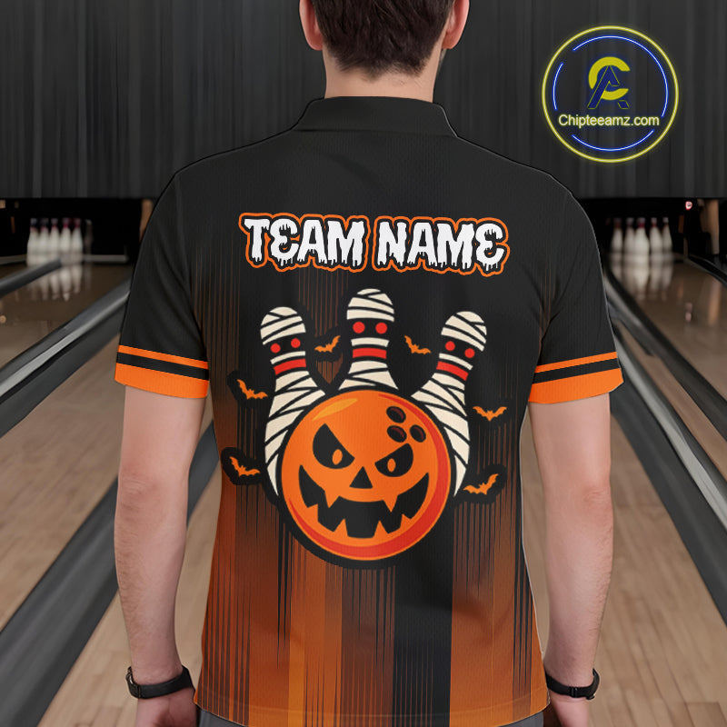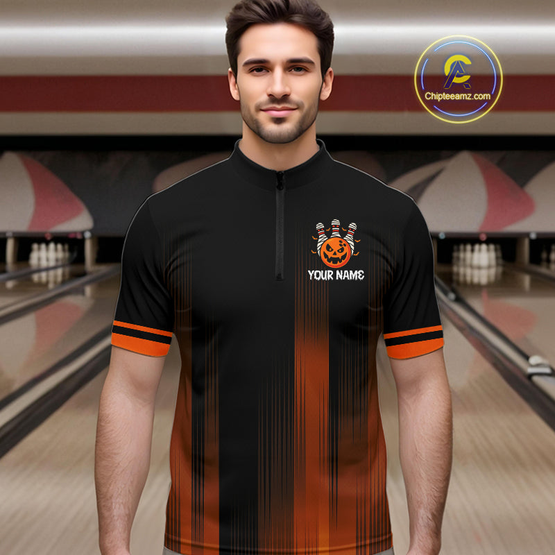 Custom Orange and Black Funny Pumpkin Ball pins Mens Bowling Team Shirts, Halloween Bowling Outfit NQS10564