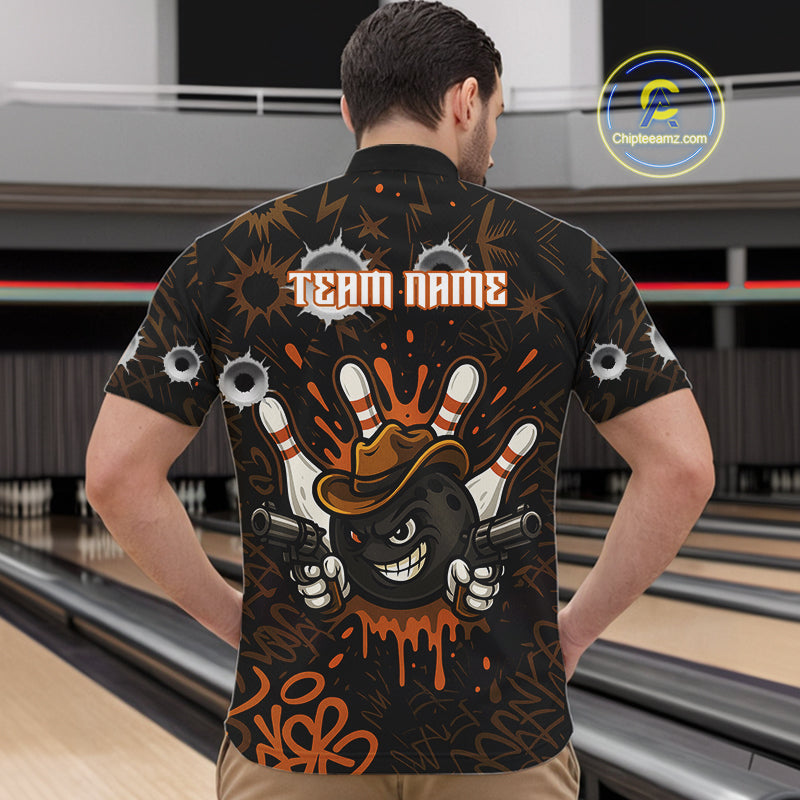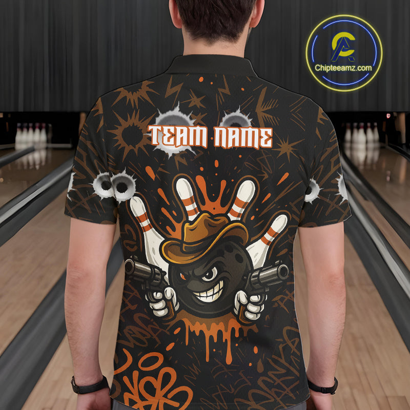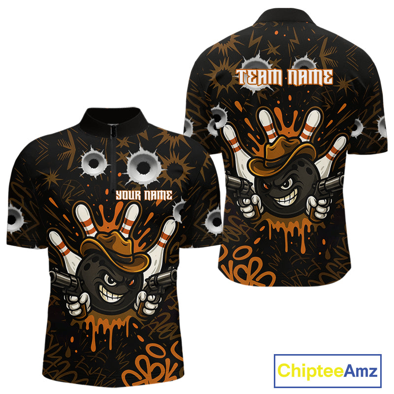 Funny Black and Orange Bowling Cowboy gun Men bowling polo, 1/4 zip shirts Custom bowling team jersey NQS10688
