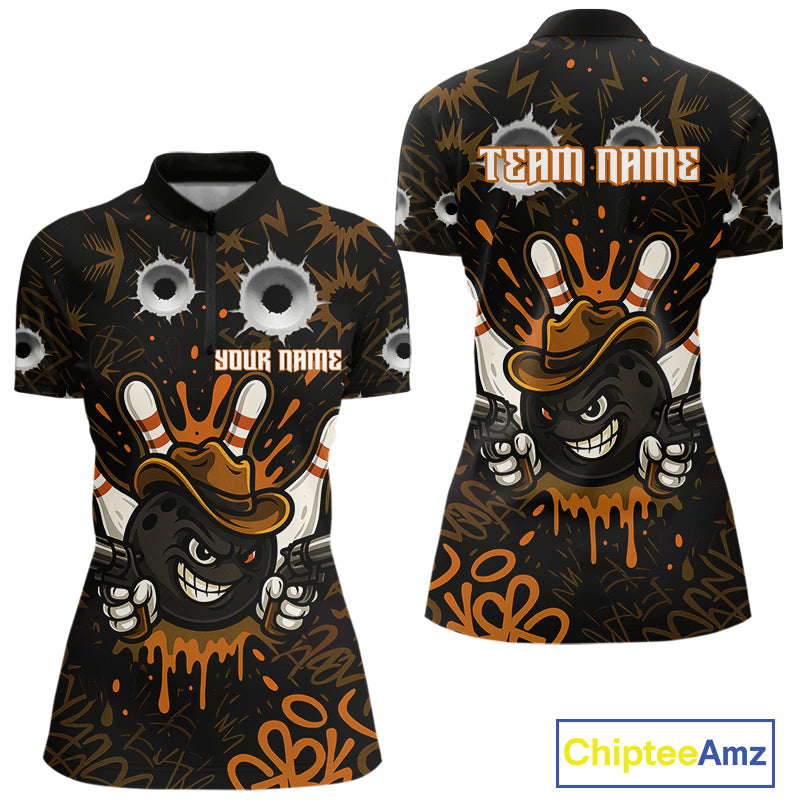 Funny Black & Orange Bowling Cowboy gun Women bowling polo, 1/4 zip shirt Custom bowling team jersey NQS10688