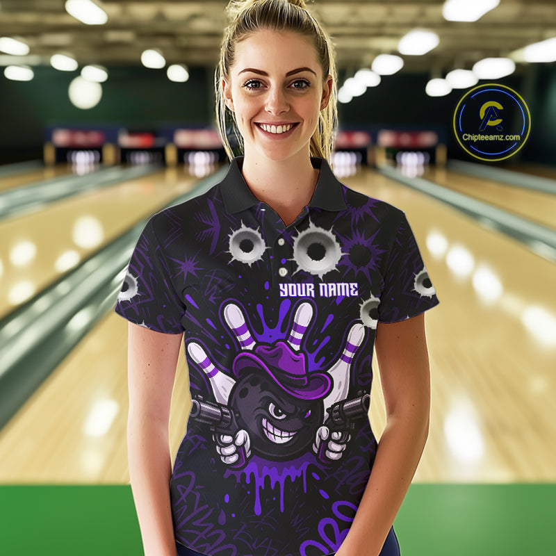 Funny Black & Purple Bowling Cowboy gun Women bowling polo, 1/4 zip shirt Custom bowling team jersey NQS10659