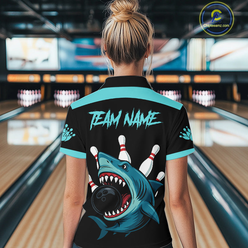 Funny Cyan Blue Shark Women Bowling Polo, Quarter Zip Shirts Custom Team Shark Bowling Outfit Jersey NQS11042