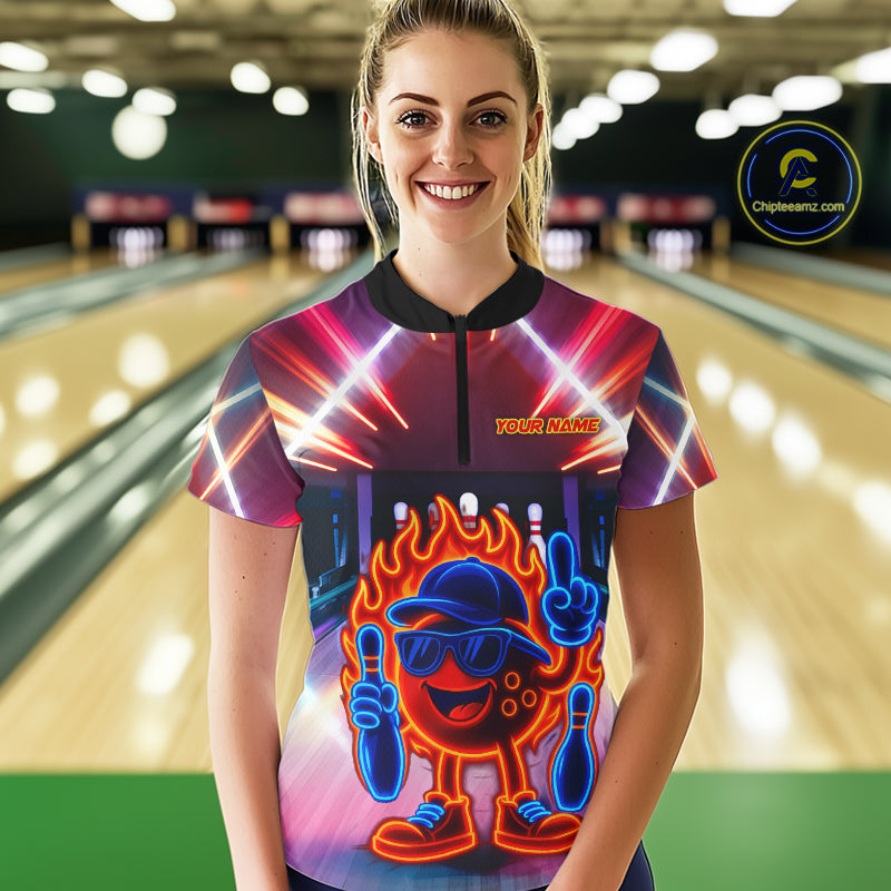 Funny Flame Neon Bowling Ball Women Bowling Polo, Quarter Zip Shirts Custom Bowling Team jersey NQS10306
