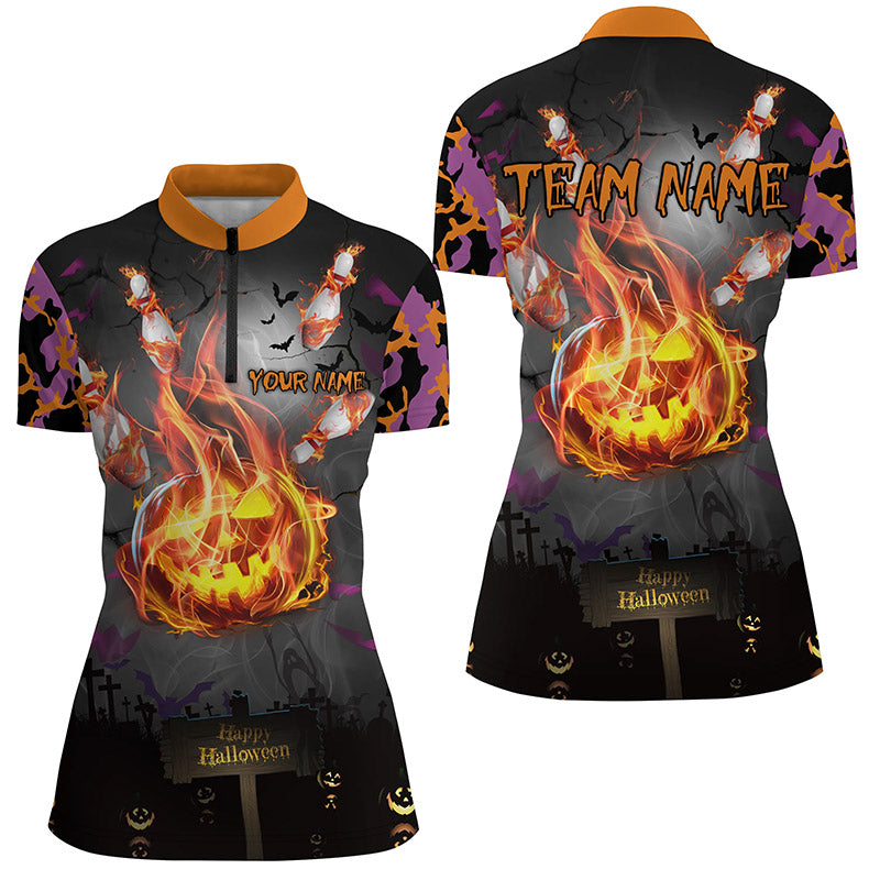 Funny Flame pumpkin Women bowling Polo, Quarter Zip shirts Custom Halloween camo Bowling Team Jerseys NQS8530