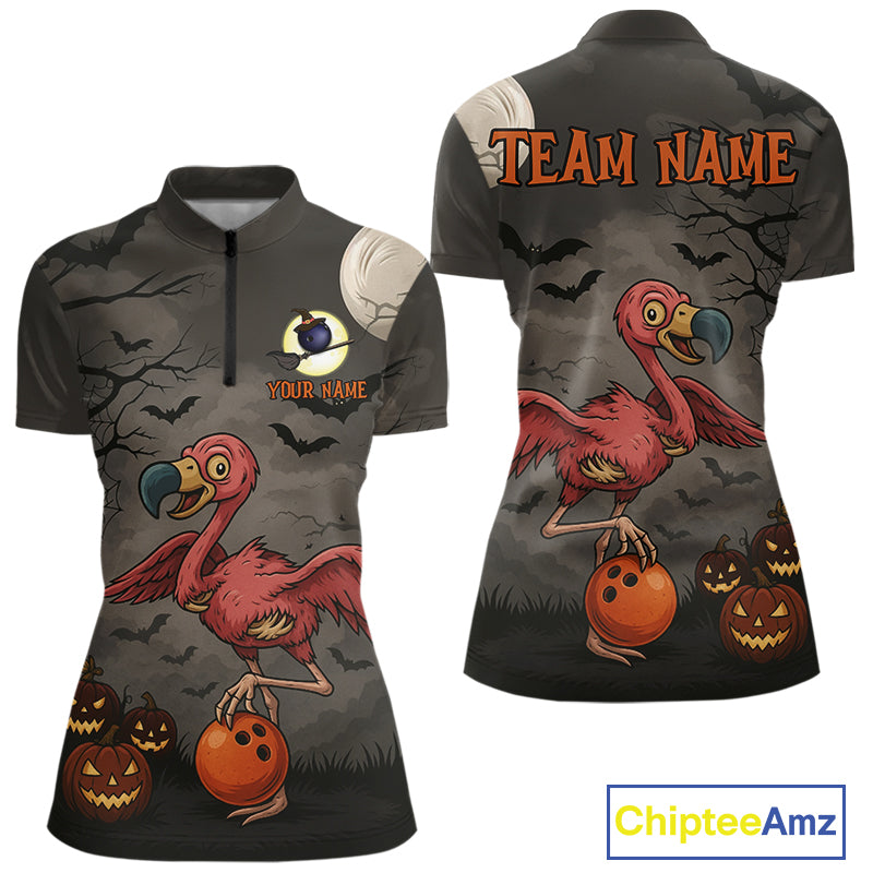 Funny Flamingo Halloween Bowling Polo, 1/4 Zip Shirt For Women Custom Halloween Bowling Team Jersey NQS10703
