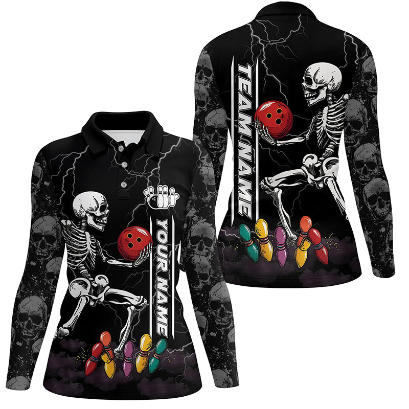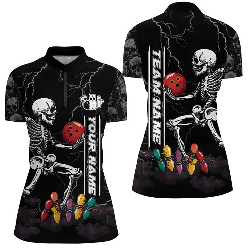 Funny Skull Bowling Women Polo, Quarter Zip Shirts Custom lightning storm Bowling Team Jerseys | Black NQS8287
