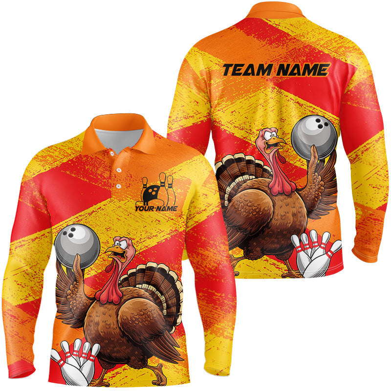Orange And Yellow Custom Funny Turkey Bowling Shirts For Men, Thanksgiving Bowling Team Outfits IPHW7882