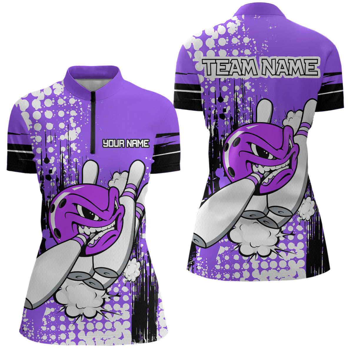 Personalized Purple Funny Crazy Bowling Shirt for Women Polo & Quarter-Zip Bowling Jersey with Team HNT03