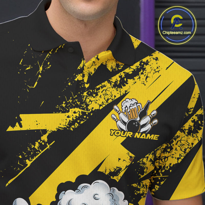 Custom Grunge Yellow Funny Bowling And Beer Polo Shirts For Men, Bowling Team Outfit IPHW9831