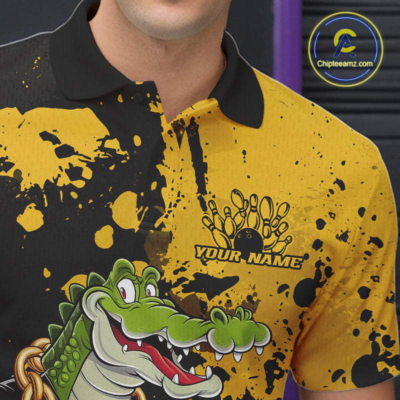 Custom Yellow Splatter Funny Alligator Bowling Men Polo Shirts, Bowling Team Shirts IPHW9920