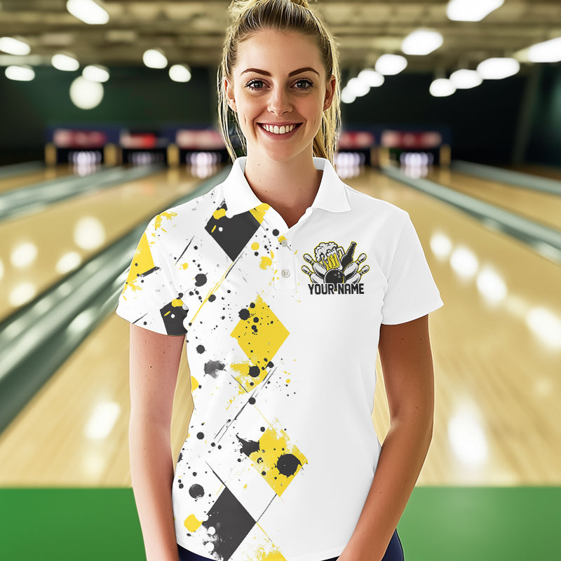 Yellow Argyle Pattern Custom Funny Bowling And Beer Team Polo Shirts For Women IPHW8889