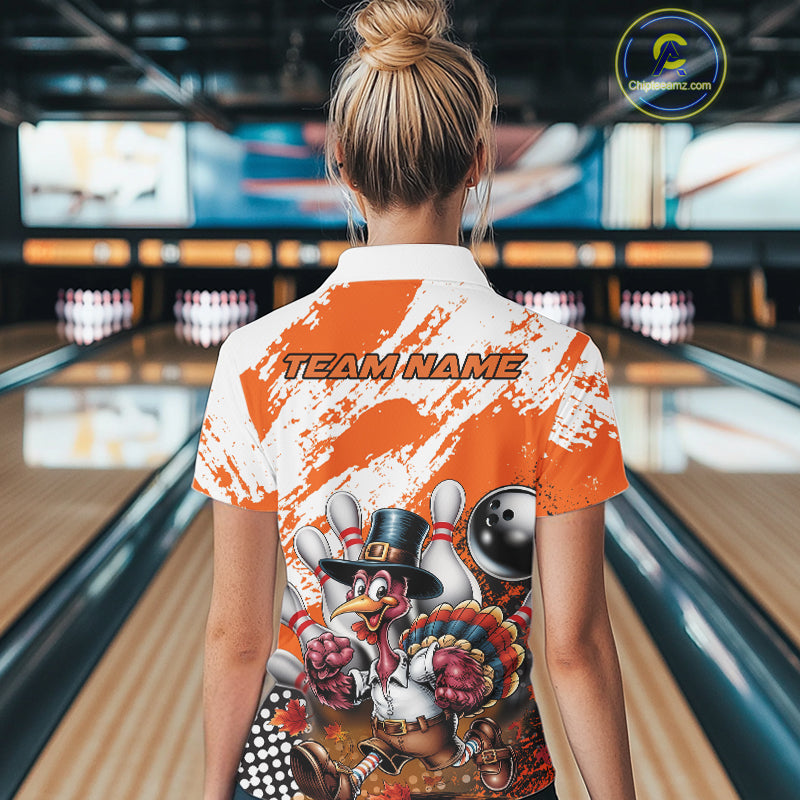 Custom Orange Turkey Bowling Women Polo Shirts, Funny Thanksgiving Bowling Team Shirts IPHW9718