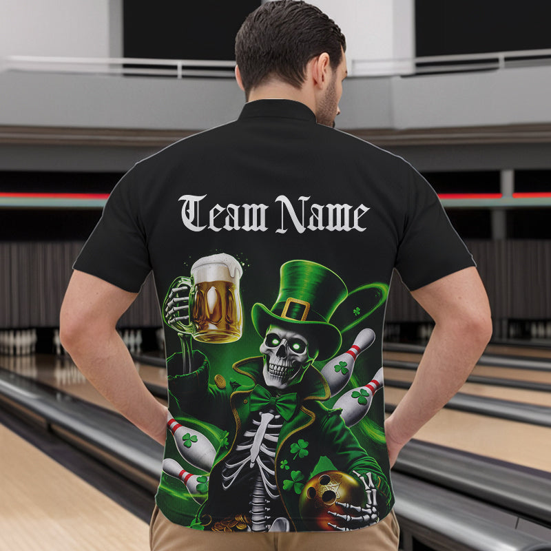 Custom Funny St Patricks Day Leprechaun Skull With Beer Bowling Team Quarter-Zip Shirts Team Outfit IPHW8603