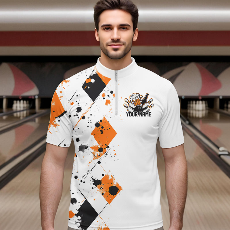 Orange Argyle Pattern Custom Funny Bowling And Beer Team Quarter-Zip Shirts For Men IPHW8890