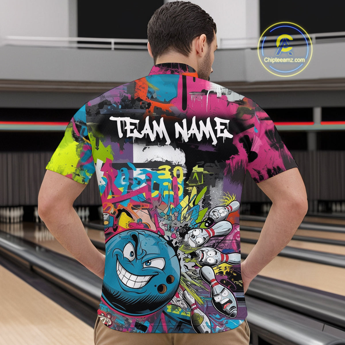 Custom Funny Graffity Colorful Bowling Quarter-Zip Shirts For Men, Bowling Tournament Shirt IPHW9382