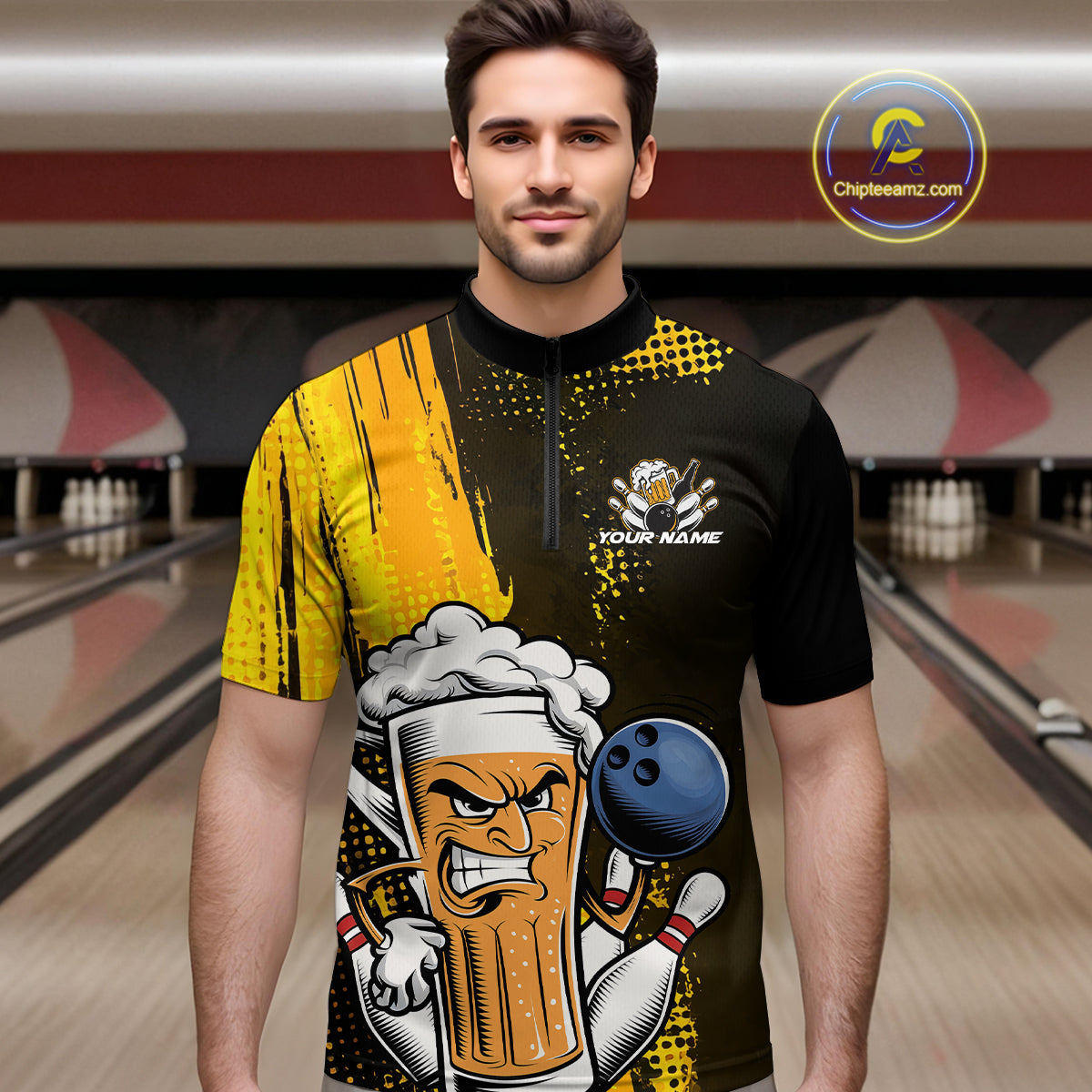 Custom Black And Yellow Funny Bowling And Beer Jerseys, Bowling Team Men Quarter-Zip Shirts IPHW9606