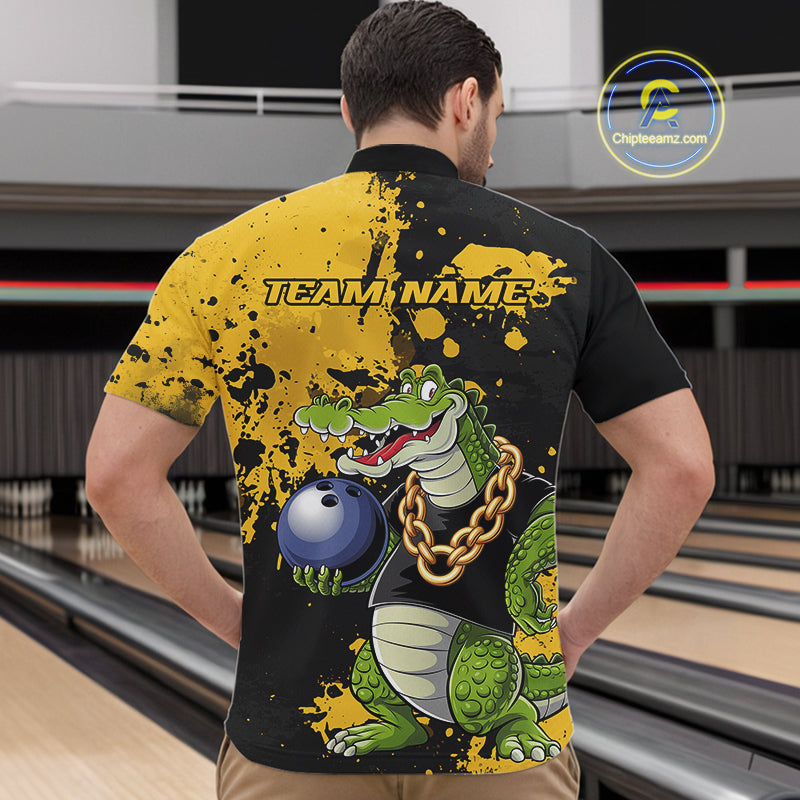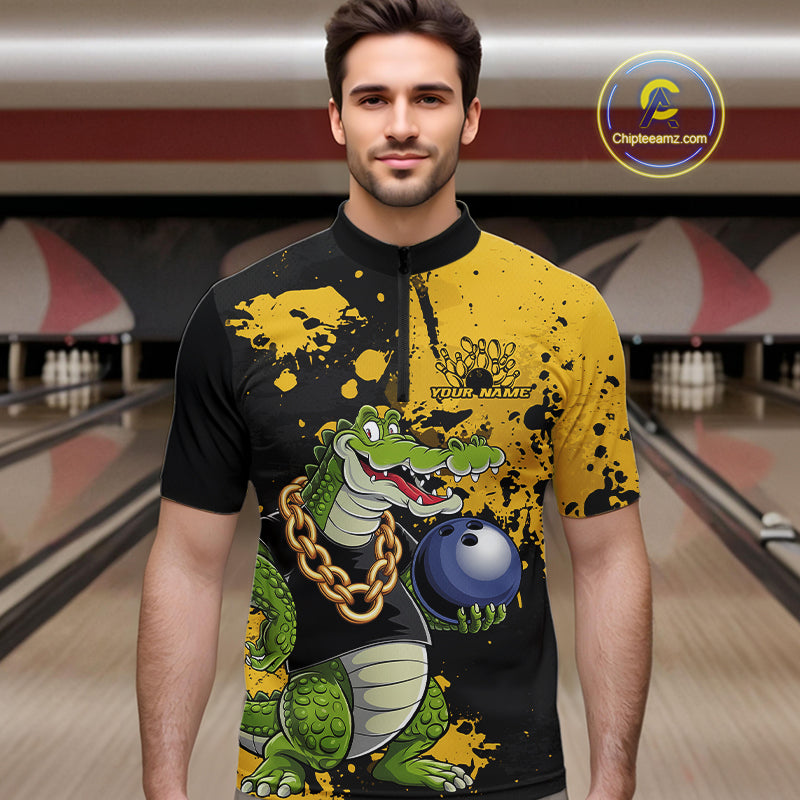 Custom Yellow Splatter Funny Alligator Bowling Men Quarter-Zip Shirts, Bowling Team Shirts IPHW9920