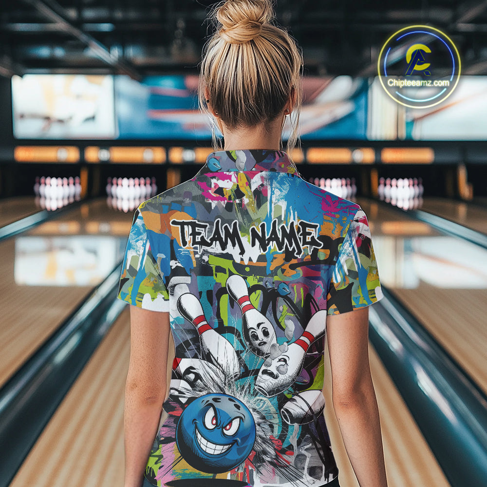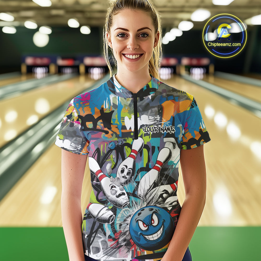 Custom Funny Graffity Bowling Quarter-Zip Shirts For Women, Bowling Team Shirt IPHW9381