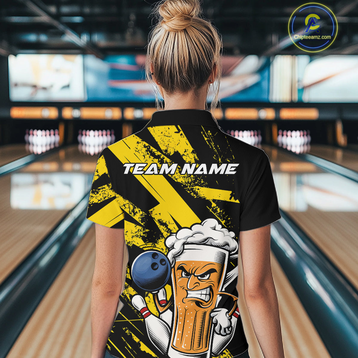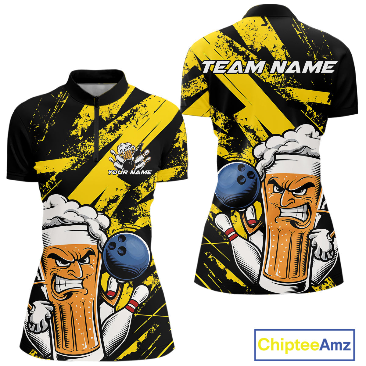 Custom Grunge Yellow Funny Bowling And Beer Women Quarter-Zip Shirt, Bowling Team Uniform IPHW9607