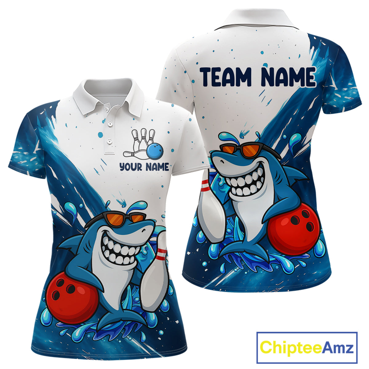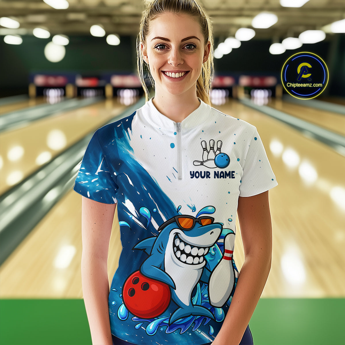 White and Blue Camo Shark Bowling polo, quarter zip shirts for Women Custom funny bowling team shirts NQS10280