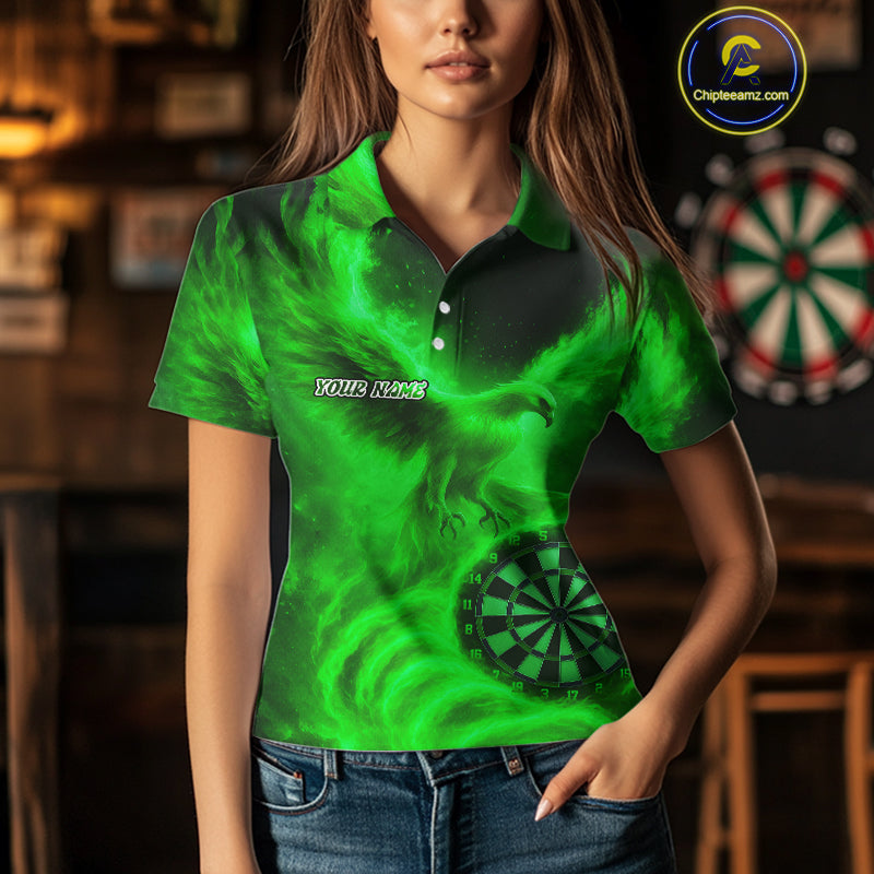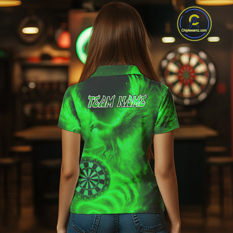 Women's Darts Polo Shirt Personalized Flaming Phoenix Dartboard Darts Jersey | Green NYN1027