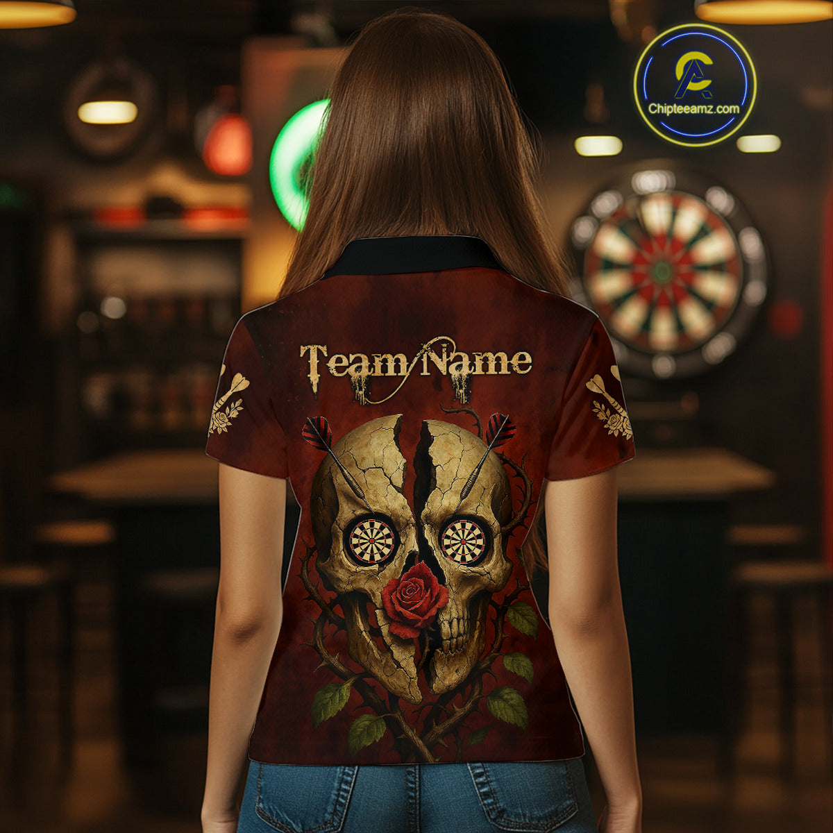 Custom Red Roses Cracked Skull Halloween Dart Polo Shirt For Women Grunge Dart Team Jersey NYN1475