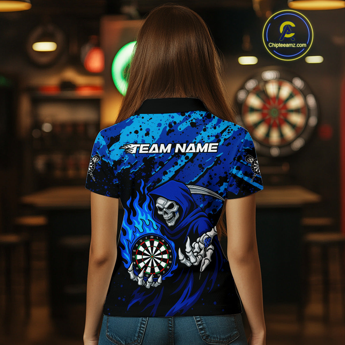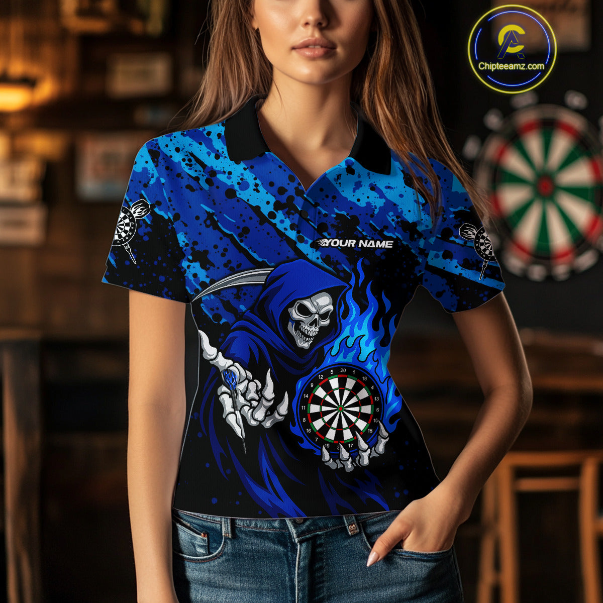 Custom Grim Reaper Blue Flames Dartboard Dart Women Polo Shirt Splatter Grunge Dart Jerseys NYN1631