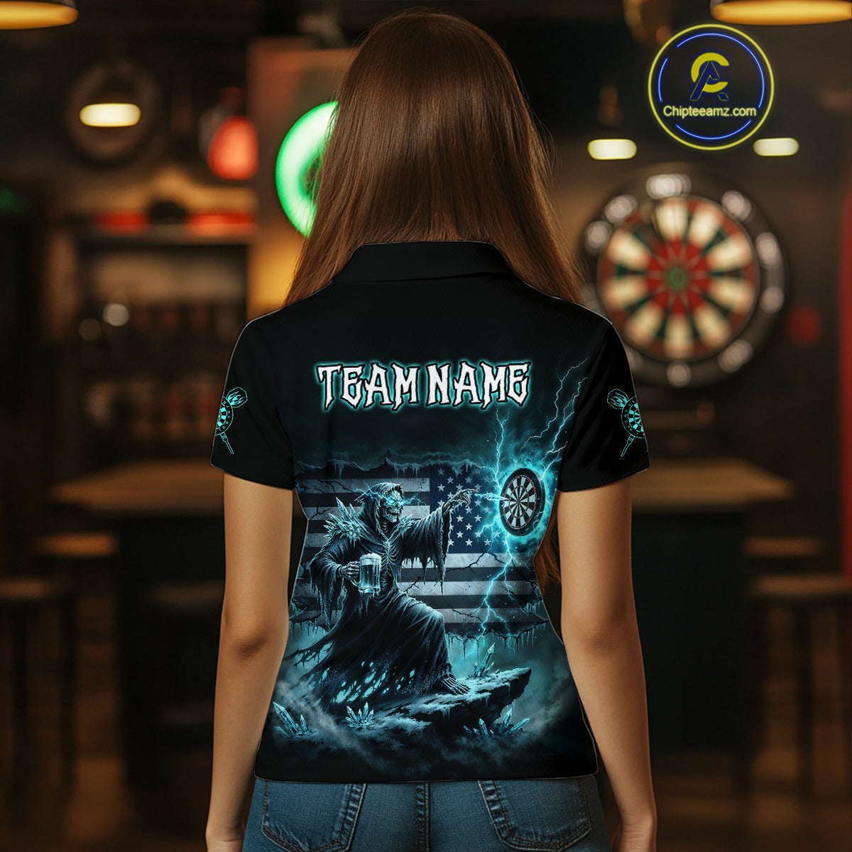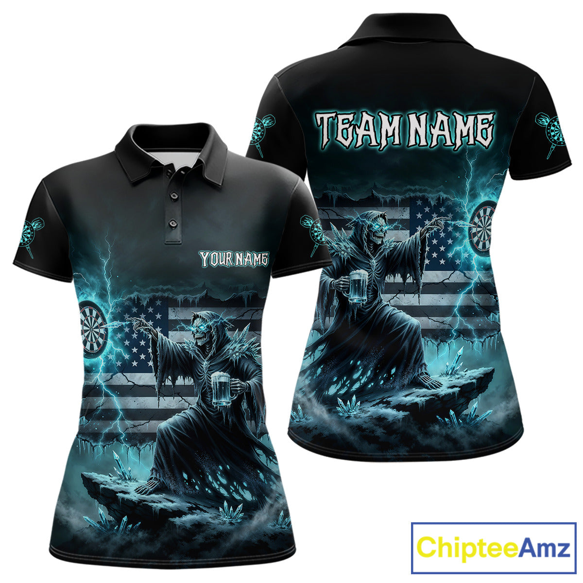 Custom Lightning Turquoise Grim Reaper Beer Funny Women Darts Polo Shirt US Flag Dart Jerseys NYN1836