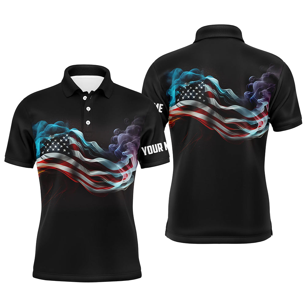 Mens golf polo shirts custom smoke American flag patriotic black golf tops for mens, golfing gifts NQS7632