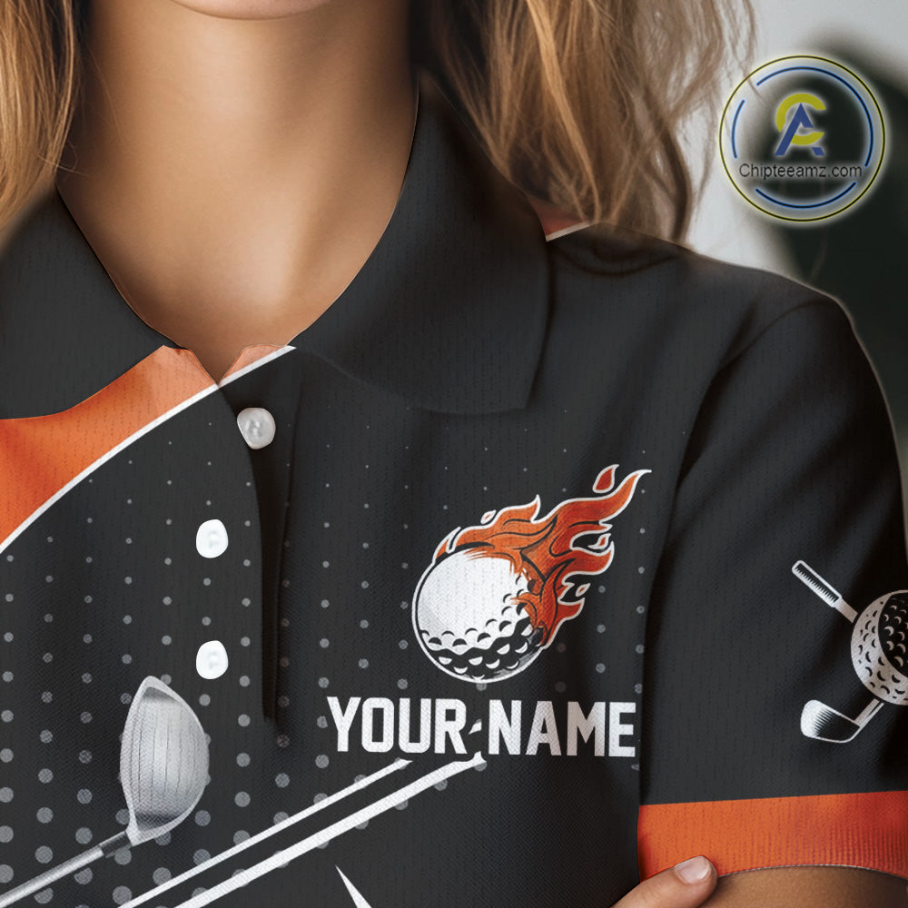 Black & Orange Fire golf ball custom Women golf polo shirt, personalized ladies golf outfit for team NQS10124