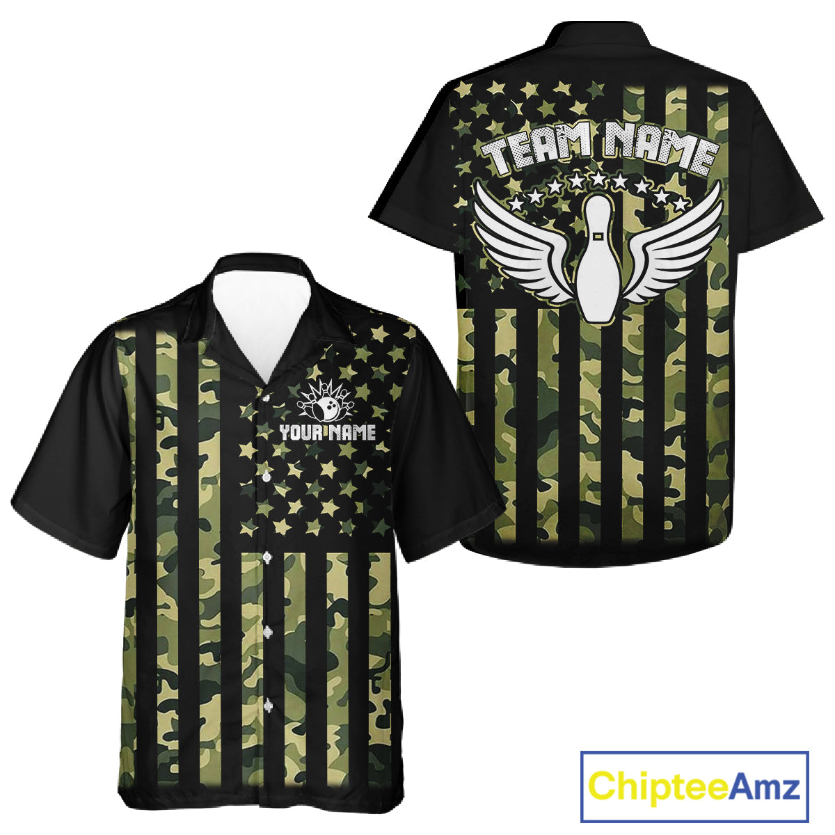 Black and Green Camo American Flag Bowling Hawaiian Shirt Custom patriotic Bowling Team shirt NQS11177
