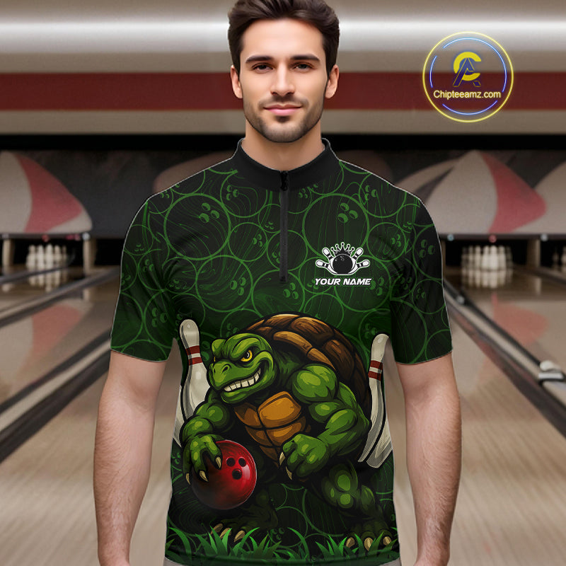 Black and Green Camo Funny Turtle Bowling Polo, Quarter Zip Shirt For Men Custom Team Bowling jerseys NQS11337