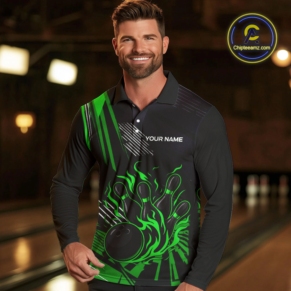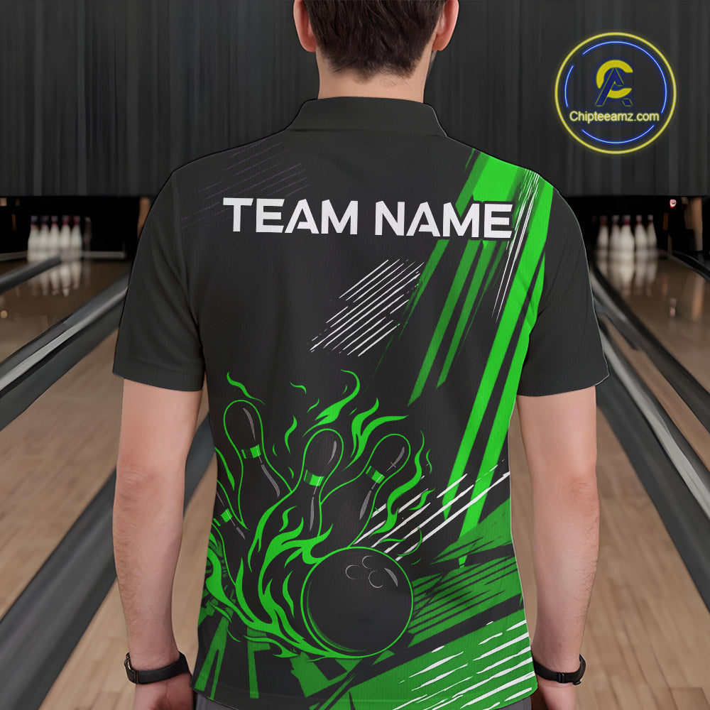 Black and Green Flame Bowling Polo, Quarter Zip Shirts For Men Custom Bowling Outfit Team Jerseys NQS10193