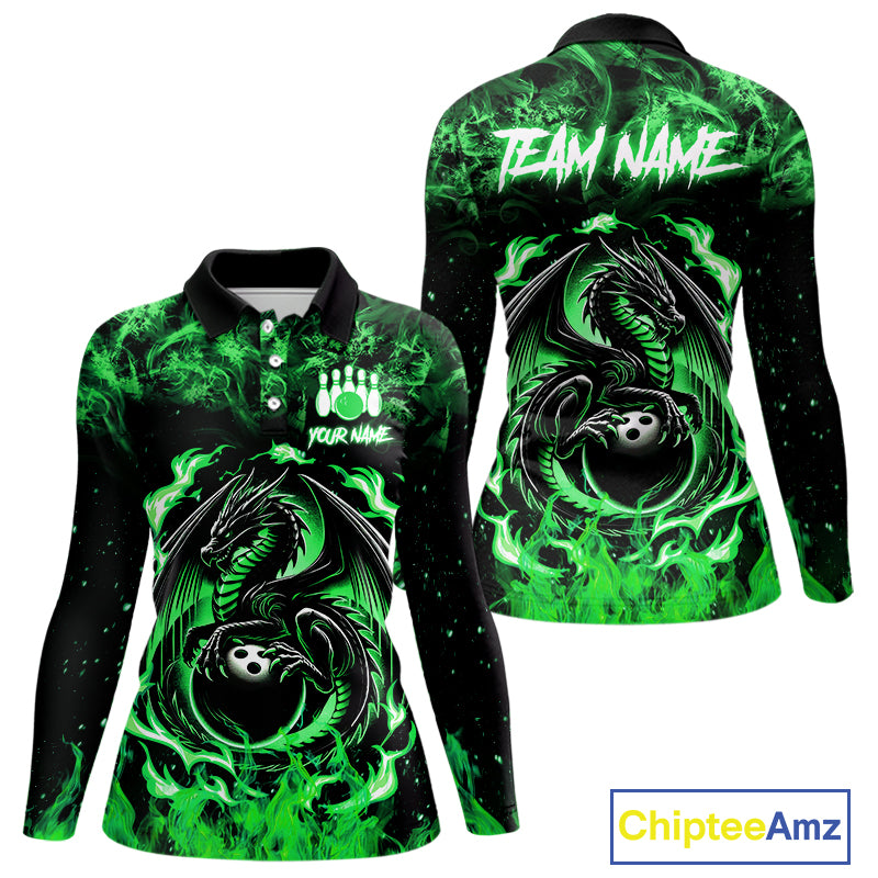 Black and Green Flame Dragon bowling shirts for Women Custom Bowling Team Jersey, gift for Bowler NQS10246