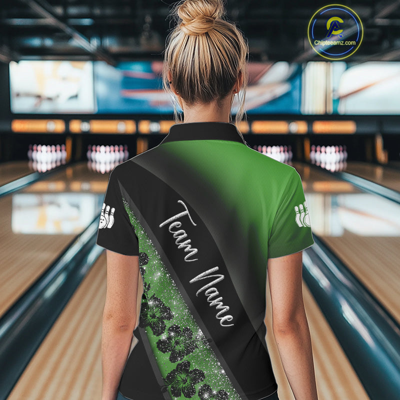 Black and Green Glitter Flower Bowling Polo, Quarter Zip Shirt for Women Custom Bowling Team Jerseys NQS10384