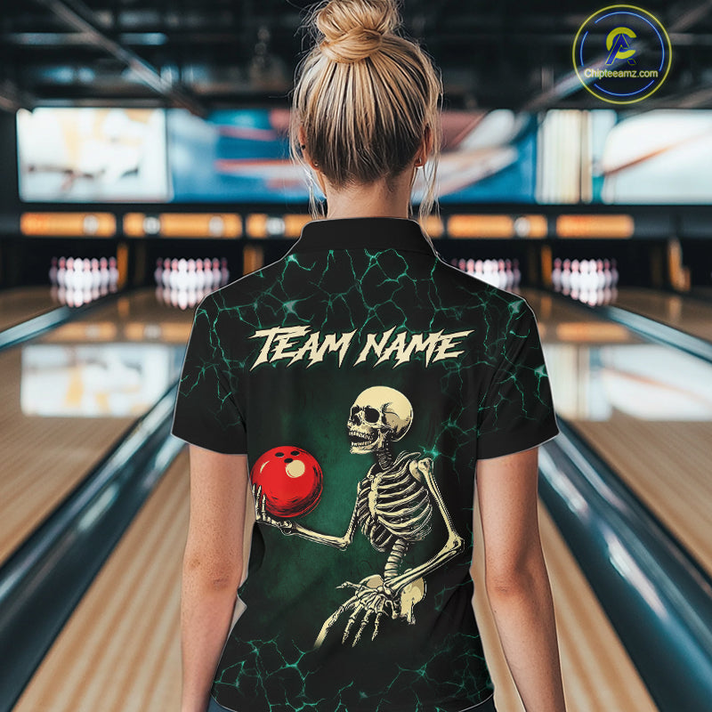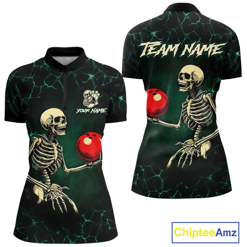 Black and Green Lightning Skull Bowling Polo, Quarter zip shirts For Women Custom Bowling Team Outfit NQS10921