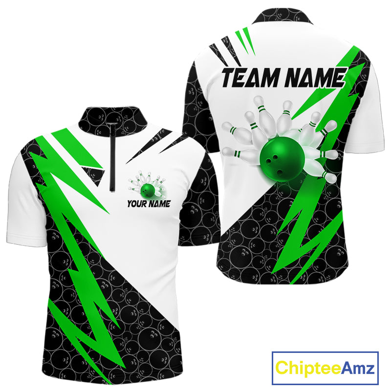 Black and White Bowling Polo, Quarter Zip Shirt for Men Custom Lightning Team bowling jerseys | Green NQS9838