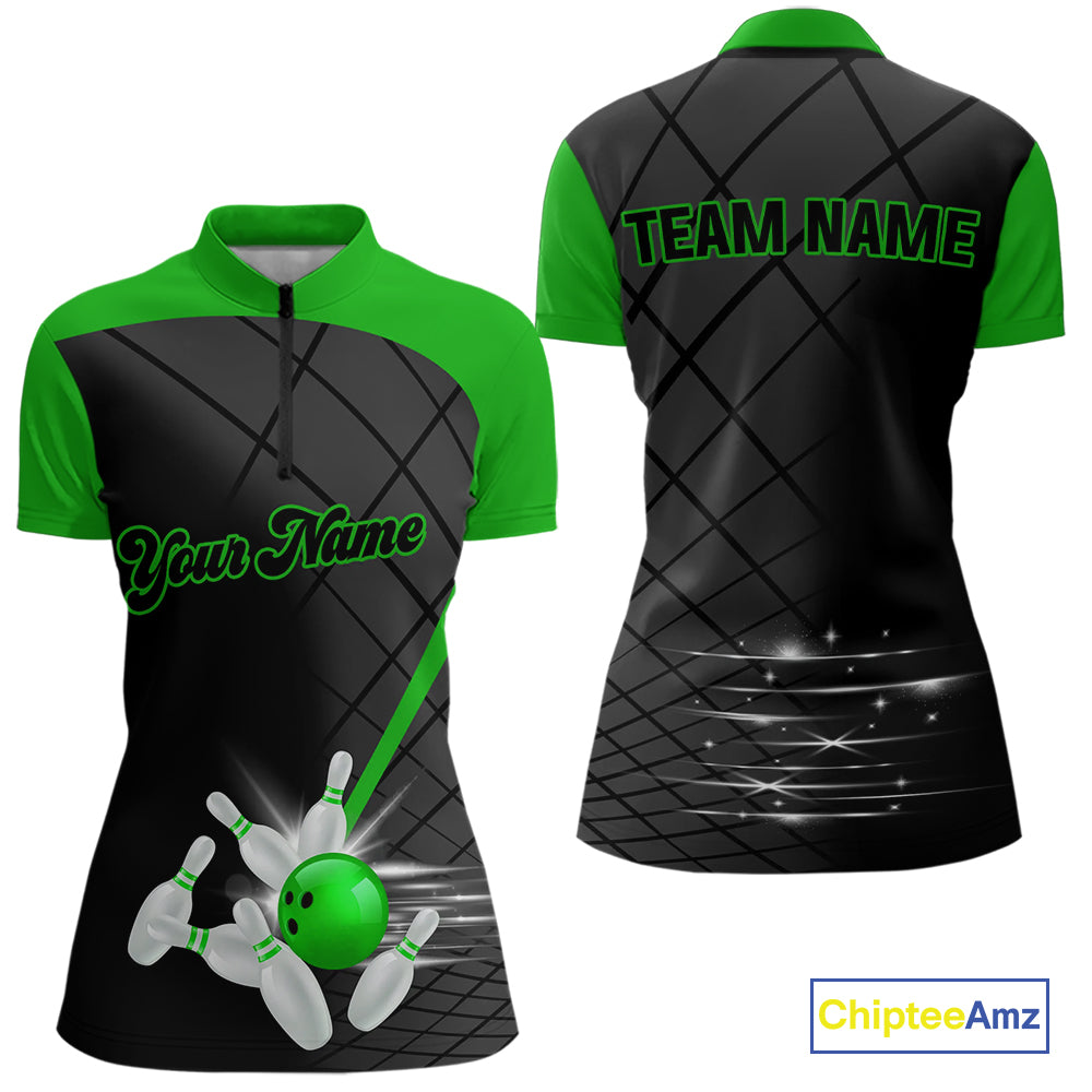 Black & Green bowling league jersey custom Women Bowling Polo, 1/4 zip Shirt, gifts for ladies bowler NQS10096